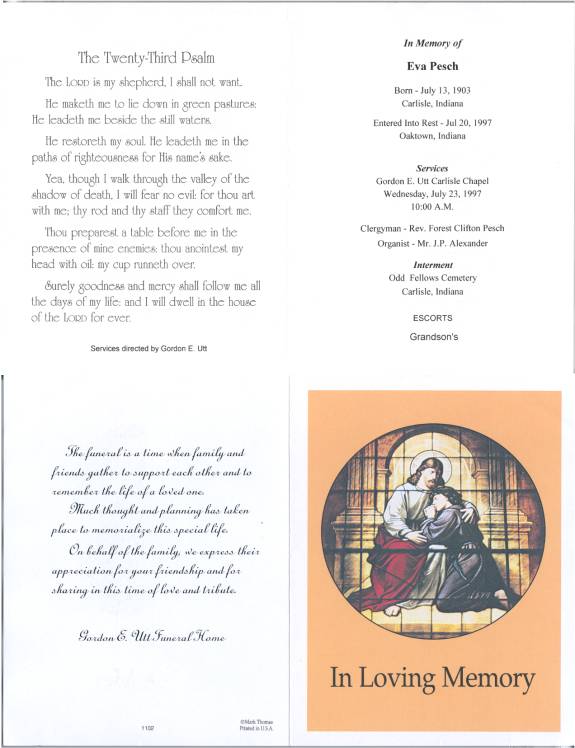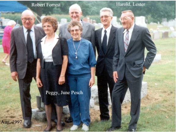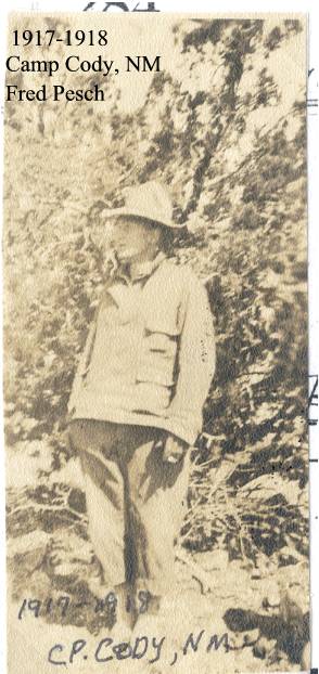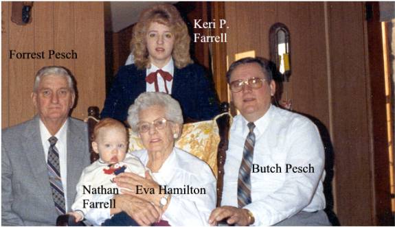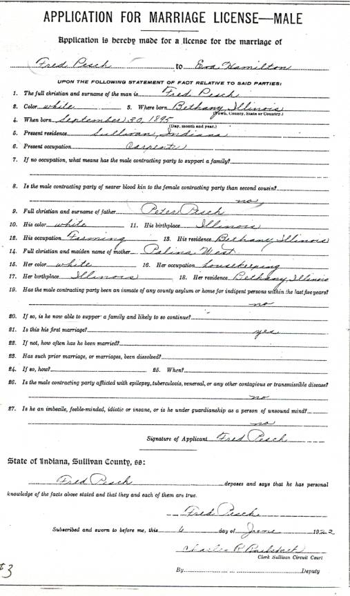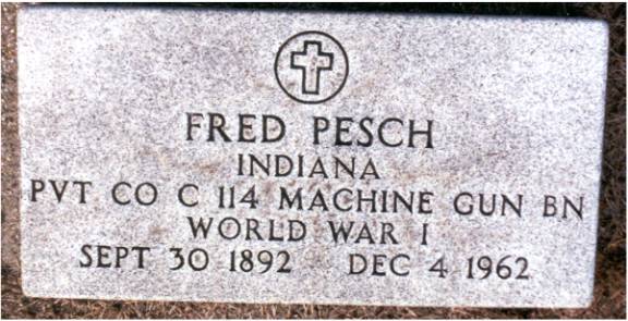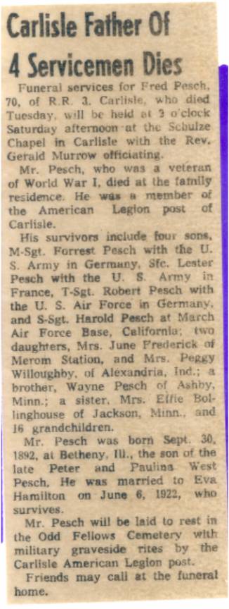 CHAPTER FIVE FRED PESCH----HAROLD PESCH FRED PESCH born 09-30-1892 Bethany, Moultrie, Illinois, died 12-04-1962 Carlisle, Sullivan, Indiana, buried Odd Fellows Cemetery, Carlisle, Sullivan, Indiana, married 06-06-1922 Sullivan, Sullivan, Indiana to EVA HAMILTON born 07-13-1903 Carlisle, Sullivan, Indiana, died 07-20-1997 Oak Village Nursing Home, Oaktown, Knox, Indiana, buried Odd Fellows Cemetery, Carlisle, Sullivan, Indiana. Father: James Melvin Hamilton, Mother Laura Belle Coleman. Fred is the seventh child of Peter and Paulina Pesch. Fred was born and raised on a farm just outside of Bethany, Illinois. He was called “Red” because of his red hair. When he was about thirteen he left home to make his own way. He worked for neighbors around Bethany and later made his way to Indiana to work for his brother in law, Fred Lambright. He eventually went to Iowa. He was around Fort Dodge, Iowa, when WW I began. It was there that he enlisted into the army. He was sent to Camp Cody, New Mexico for his basic training. It was while there that he and some other men were teasing the mules and one of them kicked him in the mouth breaking his two front teeth. He had them capped with gold. Fred went to France just before the war ended and was assigned to Company “C” 114th Machine Gun Battalion. His unit was loaded in 40 & 8 boxcars (that is 40 men or 8 mule capacity), and on their way to the front when the Armistice came. He never saw combat but was gassed once. This had serious effect on his health in later years.