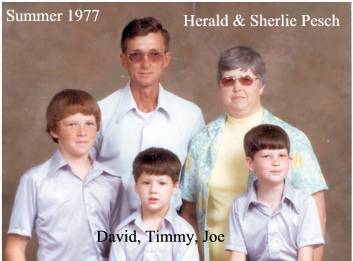BRITTANY CHRISTINE PESCH born 01-23-1989 California. DAVID EARL HOYLE-PESCH born 07-10-1964 Altus,, Jackson, Oklahoma, married , divorced 1998 to MICHELE LEE STOWELL. David is the adopted child of Harold and the first child of Shirlie Pesch. Laney adopted David in 1965. He works at construction. David and Michele have two children, Christopher and Brent. CHRISTOPHER SCOTT PESCH born 04-16-1987 Oklahoma. BRENT THOMAS PESCH born 12-15-1992 Oklahoma. TIMOTHY WADE PESCH born 01-11-1969 Merced, Merced, California Timothy “Timmy” is the second child of Harold and Shirlie Pesch. He is of the Baptist faith and not married. JOE DALE PESCH born 12-20-1971 Castle AFB, Atwater, California, married 11-04-1994 Frederick, Tillman, Oklahoma to LORI ANN COUCH born 10-07-1971 New Braunsfels, Comal, Texas, Father: Royce Couch, Mother: Mary Russell. Joe “Joey” is the third child of Harold and Shirlie Pesch. Joey is a graduate of Oklahoma University with a degree in radiology. He and Lori are of the Baptist faith and have two children, Lani and Colby. LANI JO PESCH born 11-16-1996 Altus, Jackson, Oklahoma. COLBY LEE PESCH born 08-21-1999 Altus, Jackson, Oklahoma.