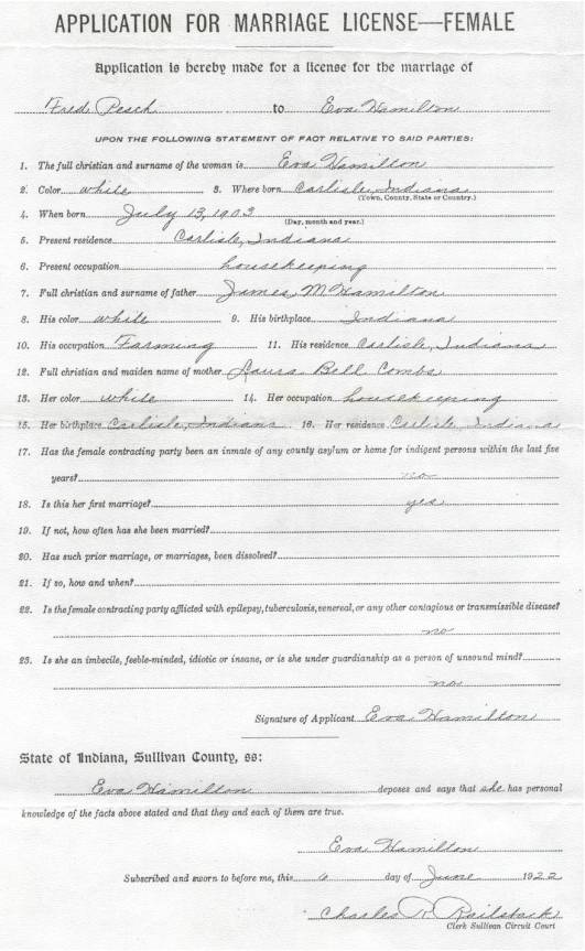 After the War he worked around Bethany for a while and then returned to Carlisle, Indiana to work for Fred Lambright again, as a carpenter. Red also worked in road construction and became a partner in the Adams, Wolf and Pesch Construction Company. They built bridges and County roads in Greene, Vigo, Knox and Sullivan counties, Indiana and in Lincoln and Crawford Counties, Illinois. It was during this time that he met and married Eva Hamilton. Eva did most of the cooking for the road hands for several years. Some times the kitchen was in a tent in the yard of where they lived. At that time the trucks were Model “T” Fords or horse and wagon. Grading equipment was horse drawn. In 1927 Fred and Eva bought a farm and a few years later Fred quit the construction and became a full time farmer. He was a dairyman and truck farmer. He grew watermelons, cantaloupes, tomatoes and sweet corn. His milking herd stayed at 20 milk cows, all milked by hand. He also had hogs and chickens. All machinery was horse drawn. He bought his first tractor in 1940, a Fordson. He didn’t have much money, not with six children to care for, but we always had plenty of food, new clothes at the beginning of school and a warm place to live. As we kids got older if we could get a way to get into town we would get enough money to see a movie and get popcorn. A lot more than some of the other kids we grew up with in our community. Red was known for his honesty and dependability. He was always willing to help any who needed it. He would let people have a cow to milk, so they would have milk for their family. He would let some keep the extra automobile as long as they needed it. He would share the meat at butchering time. When his sweet corn was ready for market he would not sell any until all the neighbors had a “mess of corn”. His opinions were highly respected in the community. Though he was asked several times to seek public office in the County he would always decline with some of his “words of wisdom”. Like, if a politician isn’t a crook before he goes into office, he will be before he gets out and I’m not a crook now and don’t intend to become one. Red had a few other philosophy sayings that still make sense today. When he was having a discussion with some one and didn’t agree with them, he would always say, “I’m just like you, only different”. When asked why he had changed his mind about something, it was “a wise man will change his mind but a fool never does”. When you questioned him about some decision he had made he would tell you “I might not always be right, but I’m never known to be wrong”. One he used in business deals was “figures won’t lie but liars will figure”. These are just a few but it seems that he always had an answer that you really could not argue with. In the days of his youth, Red loved to ice skate in the wintertime. There was a creek just behind the house that would freeze over and he could spend his whole day on it. He has told many time of the day while skating he caught the toe of one of his skates under a piece of barbed wire that had frozen in the ice and fell. He didn’t know how long he lay there but when he woke up it was dark and he heard his sister, Golda calling for him. Nothing was broken but he said he sure had a headache. After suffering for several years with Pulmonary Emphysemas, which was aggravated from being gassed in WW I, Fred died at his home near Carlisle, Indiana, of Terminal Cardiac Failure. He was buried with military honors. His four sons were all serving in the military at the time, one in California, one in France, and two in Germany, were able to come home at this time. In 1987 Eva Hamilton Pesch decided that she would write an account of her life and send a copy to each of her children, that they might have a record of part of history of the community in which they grew up. Many of the homes, farms, school buildings and community names are gone now. I was born two miles south of Carlisle, Indiana, on July 13, 1903. We lived on what was known as the C.T. Atkins farm. My parents are James Melvin Hamilton and Laura Belle Coleman Hamilton. I grew up with two brothers and three sisters, King, Wayne, India Hamilton Meeks, Jessie Hamilton Kaiser and Bessie Hamilton Miller. The first thing I remember is Dad leaving me in the buggy alone while he led the horse through the gate and closing it. The next was some cousins catching some birds in a shed. I was told they were guineas. We moved from there to a farm north of Carlisle and all I remember there, is a girl named Rose and a big turkey gobbler with a big tail. We next moved to the Bond farm, south of Carlisle. There were two houses on the farm and we lived in both before leaving there, moving to the Harriet Brown farm. I had started school by this time at the Cocklebur School. The community where we lived was called “Browns Ridge”. There were several neighbor kids close enough to run in and out and to play with. We played jump rope, hide and seek, dare base, kick the can, and town ball. In the winter when it snowed we played fox and goose. In March of 1913 we had a flood and it covered the whole river bottoms except seven acres where the houses and barns stood. Seventeen people came out of the flood and stayed there. The men slept in the barns and the women and children slept in the houses. We moved in the fall to the Lafe Boone farm. There was a cement tile factory on the farm and Dad worked there as well as helping with the farm work. I entered school at the Shepard School in “Shaker Prairie Community”. There were only a few kids close enough to try to get any games going. We lived there two years. We moved to the Peyton Tucker house. The community was known as “Tucker Town”. I went to the Climax School for one year. When school was out that year we moved to what is now known as the Squires place. It is in the same community where I first stared to school, the Cockl